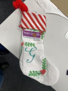 A Christmas stocking made from old lab coats during a Christmas Eco-Crafting event. (Photo credit: Sara Shaqiri)