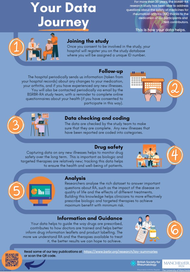Have you ever wondered what happens to the data that is collected as part of the BSRBR-RA Study?ย We have recently published a new data journey to help our participants to understand the impact that their data has had on the real world of rheumatology.