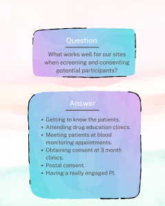 It was useful βTo listen to what worked and what hasn’t worked with recruitment with other sitesβ¦ reminder to use the patient engagement material and outreach consent process.β