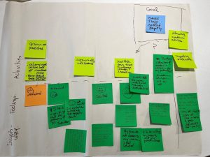 One student discussed his journey of overcoming stress and confusion about an assignment’s instructions. He wrote on a post-it-note that he was worried about completing an assignment due to complicated instructions that he was unfamiliar with. He was asked what steps he took to alleviate this stress, to which he answered that he asked the professor for further instructions. After this conversation, he felt slightly less confused, but still not entirely confident. He then made the decision to talk to friends in his course to clarify the project. After this, he was feeling mostly confident. We used the post-it-notes he had filled with details about his experience and how it made him feel to create a diagram on poster board.
