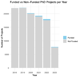 Figure 1 – Number of Funded versus Non-funded PhD Graduates per Year. Source: Analysis of EthOS and UKRI metadata.