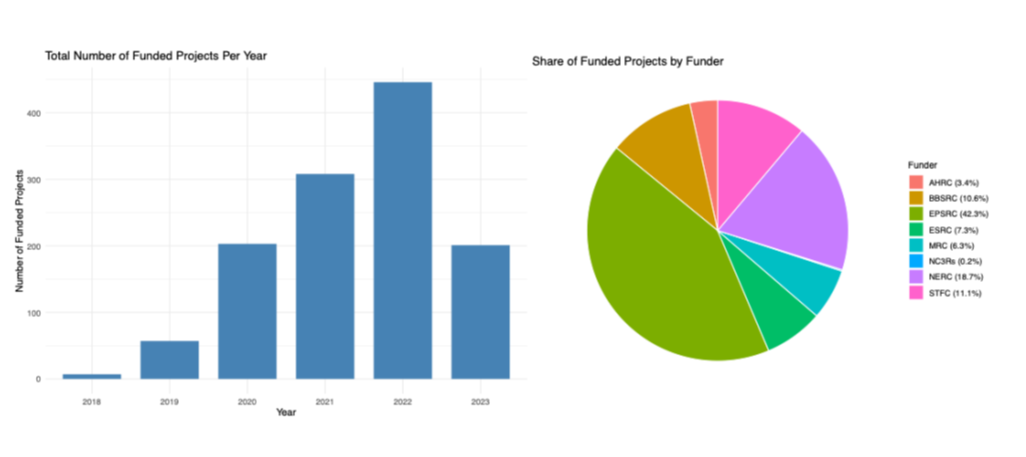 To identify UK PhD projects that had received funding, and understand how this funding is distributed within the UK, I combined information from two publicly available datasets: 1) UKRI Studentships data: records of funded PhD projects supported by several funding bodies and 2) The EThOS thesis repository (focussing on theses completed between 2019-2023): the British Libraries online service documenting doctoral theses from UK universities.