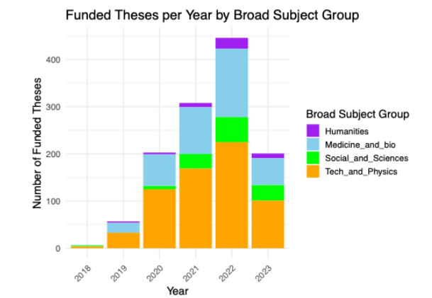 This is reflected in Figure 2, where the 1,200 funded projects successfully identified and matched between 2019 and 2023, represent only around 1% of all theses recorded in EThOS during this period. The number of funded dissertations still rises steadily year on year during this period, reaching a peak in 2022 with more than 400 matches, and accounts for an increasing share of overall dissertations.