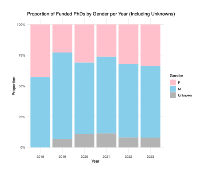 The gender breakdown of funded PhDs presents a consistent imbalance. Across all years, male candidates were more likely to be funded than female graduates. Men consistently account for around 65-70% of funded projects, whilst women make up 30-35%. Although there is an increase in female funded projects, the gender gap has not narrowed significantly over the six-year period (Figure 4), a pattern that is reflected in the overall gender gap in science and engineering PhD graduates.