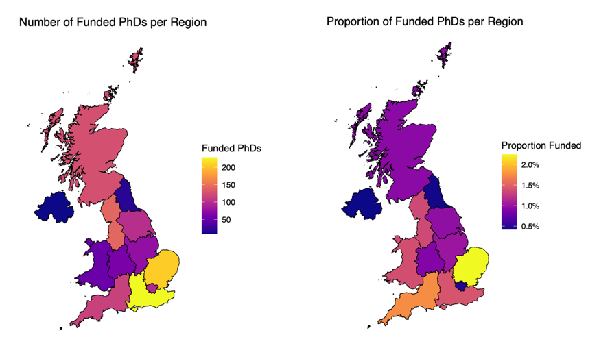 Figure’s 5 and 6 – The Total Number of Funded PhD Graduates per Region in the UK and the Proportion of Funded PhDs per Region in the UK. Source: Analysis of EthOS and UKRI metadata.