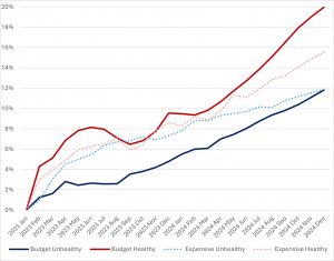 Our analysis reveals that the “cost of living” crisis has evolved into a specific “cost of health” crisis. Starting in mid-2023, the price trajectories of healthy versus unhealthy staples began to decouple.